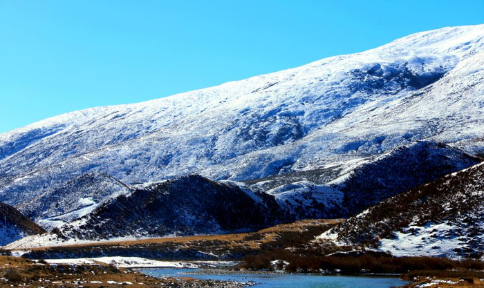 四川省甘孜藏族自治州理塘县,高山被白雪覆盖,与蔚蓝的天空、近处枯黄的草地相映成趣,景色壮丽。
