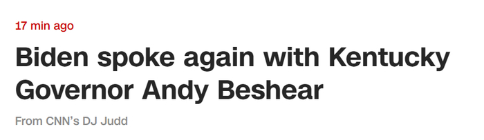 美国有线电视新闻网(CNN)刚刚消息,美国总统拜登当地时间11日晚再次与肯塔基州州长安迪·贝希尔通话,了解龙卷风侵袭下“最新的损失评估和搜救工作最新情况”。