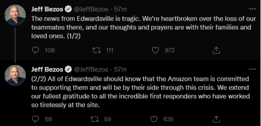 “来自爱德华兹维尔的消息是一场悲剧。我们对在那里失去的团队成员感到心碎,我们的思绪和祈祷也与他们的家人和亲人同在。”贝索斯写道。