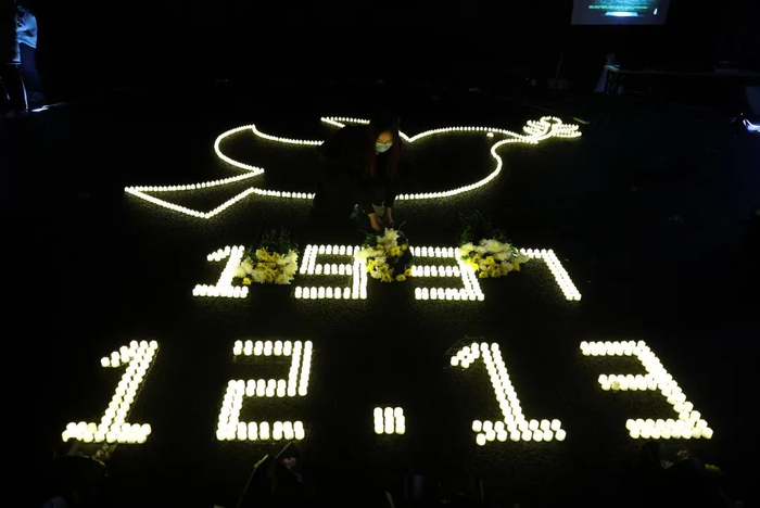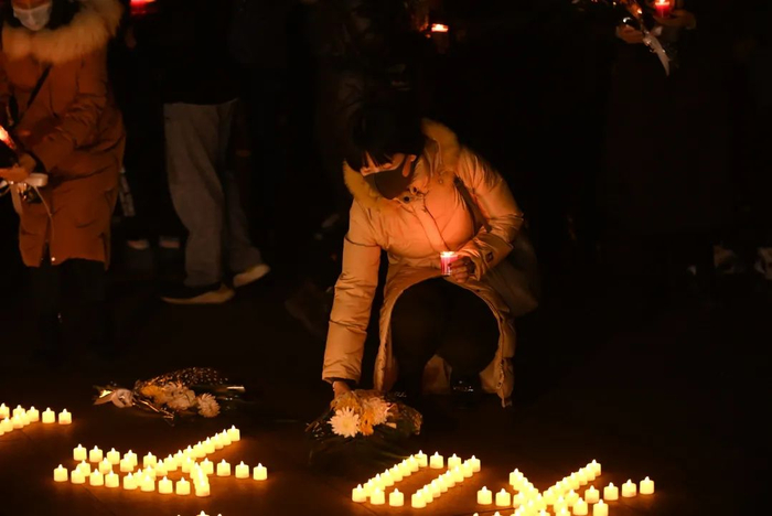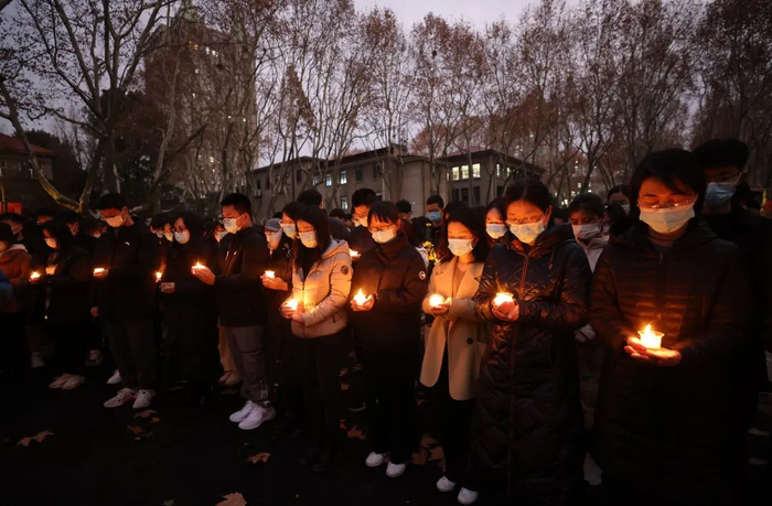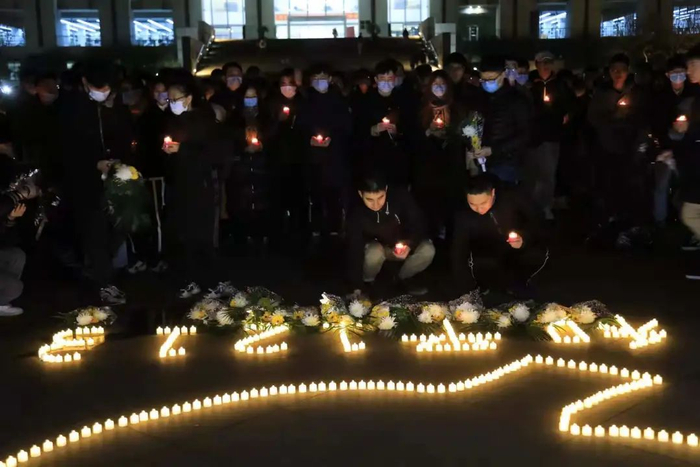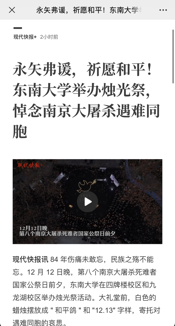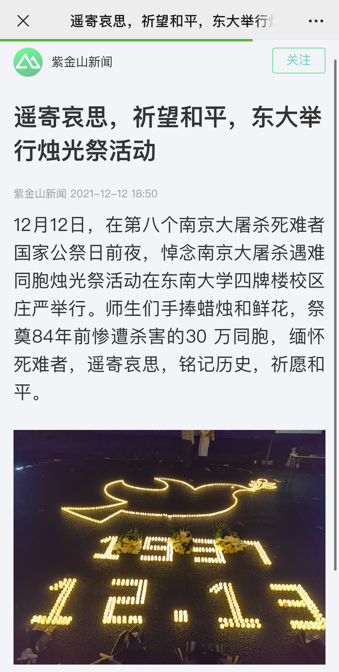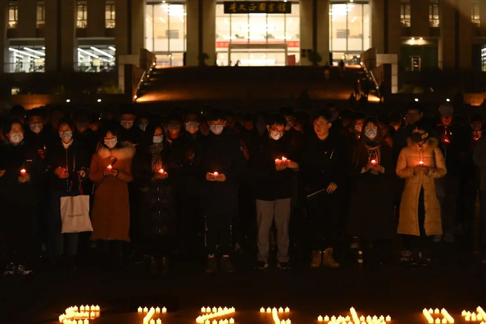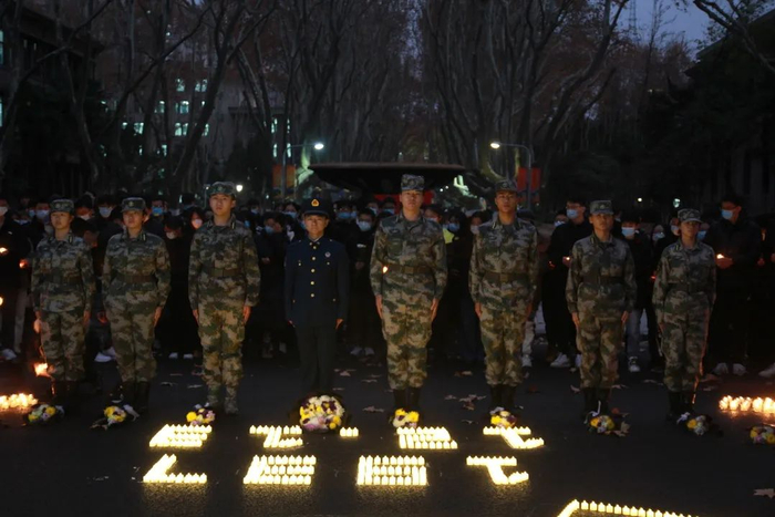 在四牌楼校区大礼堂前,树叶凋零的梧桐树下,东大学子用蜡烛摆出 "1937 12.13" 字样和 "和平鸽" 图案。师生们汇聚到大礼堂前,进行集体默哀仪式。表达对南京大屠杀遇难同胞哀思,在摇曳的烛光中祈愿和平。