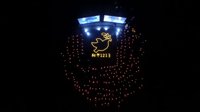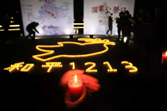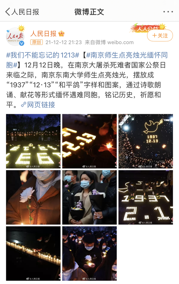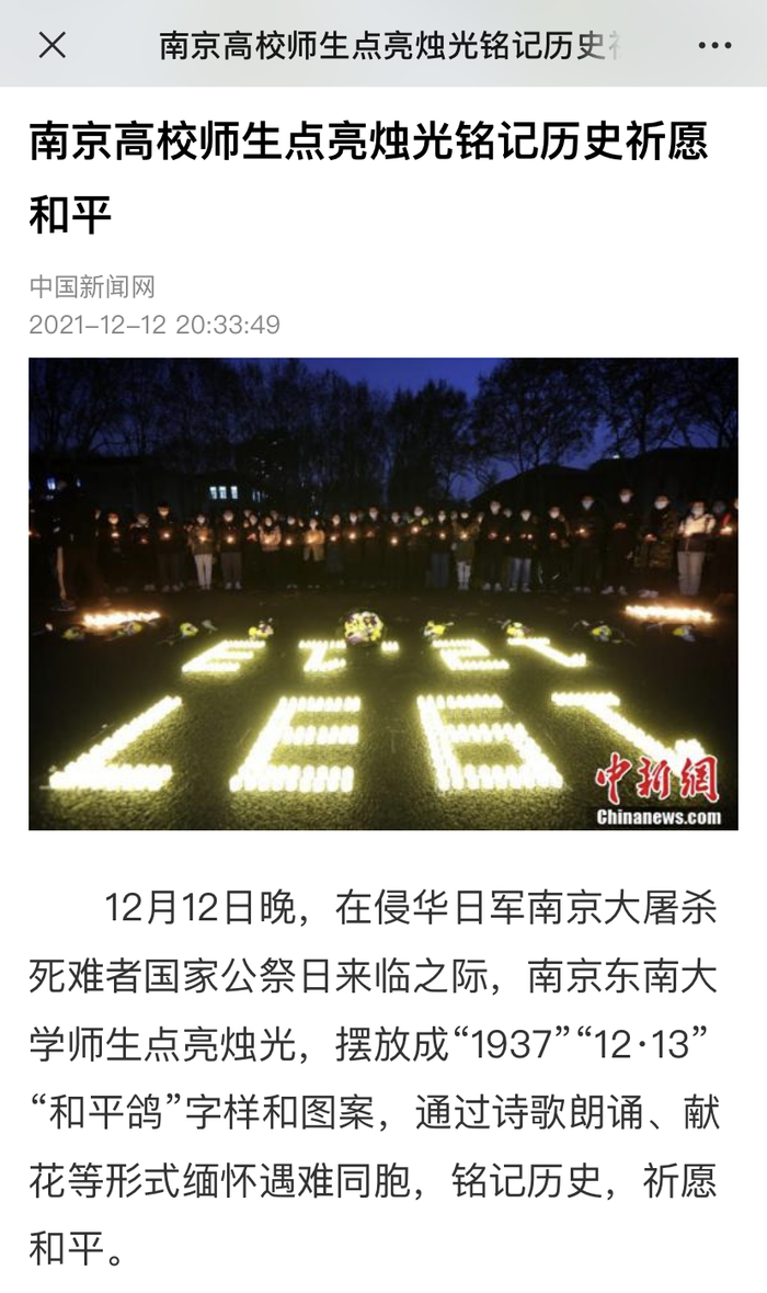 在九龙湖校区,现场用蜡烛摆放成“和平鸽”图案和“和平1213”字样,悼念南京大屠杀遇难同胞,寄托哀思;铭记历史,祈愿和平。