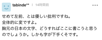《赫芬顿邮报》的报道引发热烈反响,日本网络上对以色列人设计的服饰的抨击愈演愈烈。还有网友评论称:“至少别‘左前’真是‘温柔’的批评。服装整体就很怪。怎么样才会想出在胸口写上‘日本’?而且字还写得非常难看。”