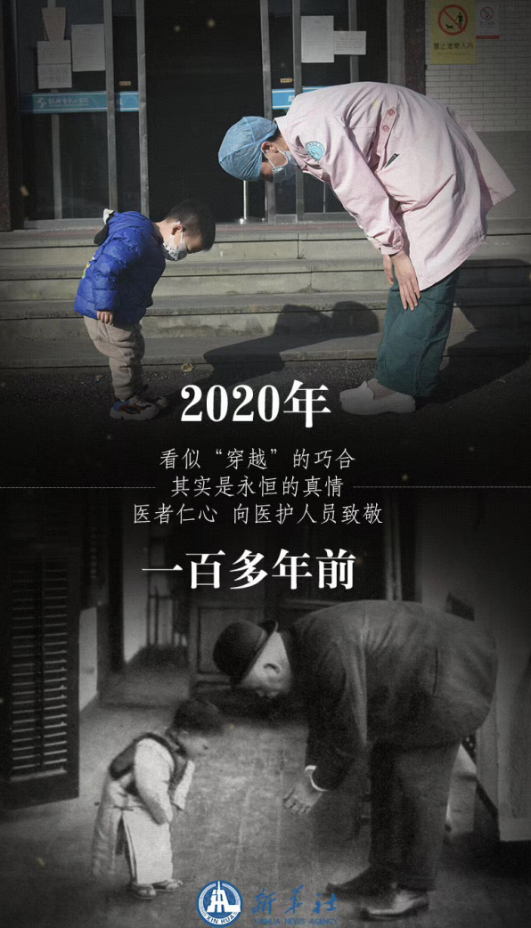 2020年新冠肺炎疫情期间,两张“最萌的鞠躬礼”的对比照片,定格了相似的瞬间,也像是一股暖流,温暖了人们被疫情阴霾笼罩着的心。