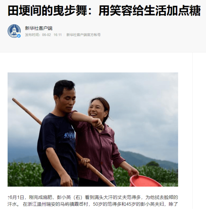 无疑,郑梦雨的这篇报道,一定程度上也改变了彭小英和范得多夫妇的命运。多家主流媒体看到报道后,也来到浙江温州,通过文字、视频等多种形式,报道了彭小英和范得多夫妇的生活和舞蹈。如今,俩人直播平台上的粉丝数已超过四百万人,成为“小网红”的他们,直播跳舞、助农,带动当地农产品销售,用乐观的生活态度和治愈的笑脸,感染越来越多的人。