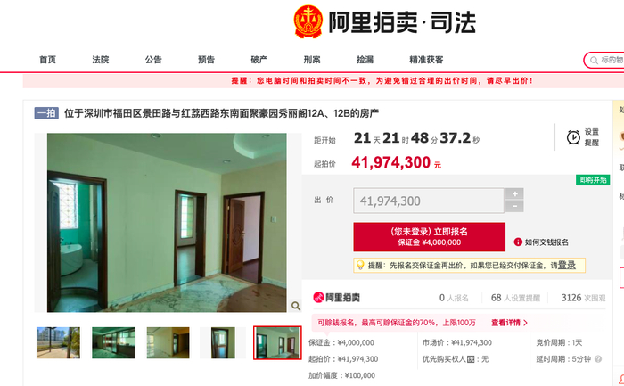 12月14日,红星资本局从阿里拍卖平台获悉,康美药业(*ST康美,600518.SH)原董事长马兴田,其位于深圳市福田区的两处房产即将被拍卖。根据拍卖公告,被拍卖的房产位于深圳市福田区聚豪园秀丽阁,两处房产之间相连相通,总建筑面积506.63平方米。起拍价为4197万元,需缴纳保证金400万元。