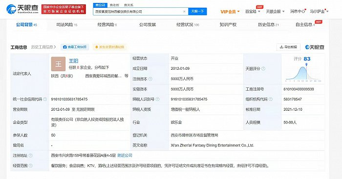 西安真爱范特西餐饮娱乐有限公司成立于2012年1月,法定代表人王阳,注册资本5000万人民币。经营范围含餐饮服务;食品销售;KTV、酒吧,现由西安真爱服务事业股份有限公司全资持股。