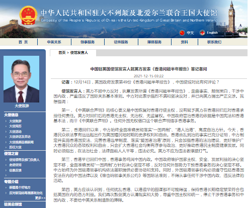 记者:12月14日,英国政府发表第49份《香港问题半年报告》,中国使馆对此有何评论?