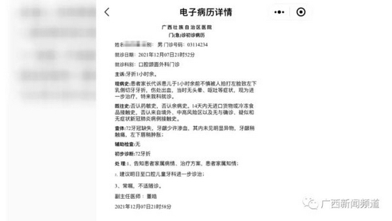 叶女士看见儿子嘴里,一颗断牙挂在牙龈上,她以为是儿子换牙才导致的出血,没有多想就简单帮他处理了一下,随后孩子又进入了教室。