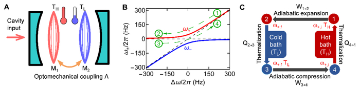所实现的耦合光力系统具有极大的优势,通过精确调控耦合系统的本征模式,使两支本征模式在一个热机循环中交替做功,进一步实现了双缸随机热机。该实验可推广到更为复杂的热机阵列,有助于研究有限时间量子热力学以及进一步提高输出功率和做功效率。