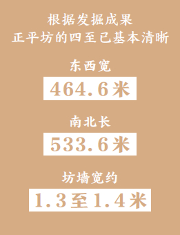 根据发掘成果,正平坊的四至已基本清晰,东西宽464.6米,南北长533.6米,坊墙宽约1.3至1.4米。南、北坊门大致位置明确。坊内十字街道路和坊外的南(永通门大街)、东、北三条大街的位置、宽度、保存状况均已清楚。其中,坊内东西向街宽约10米,南北向街宽约8.7米;正平坊外南侧的永通门大街及东侧大街宽约71.7米,北侧大街宽33.4米。考古工作者在街道上发现车辙密布,可以想见当时车水马龙的景象。