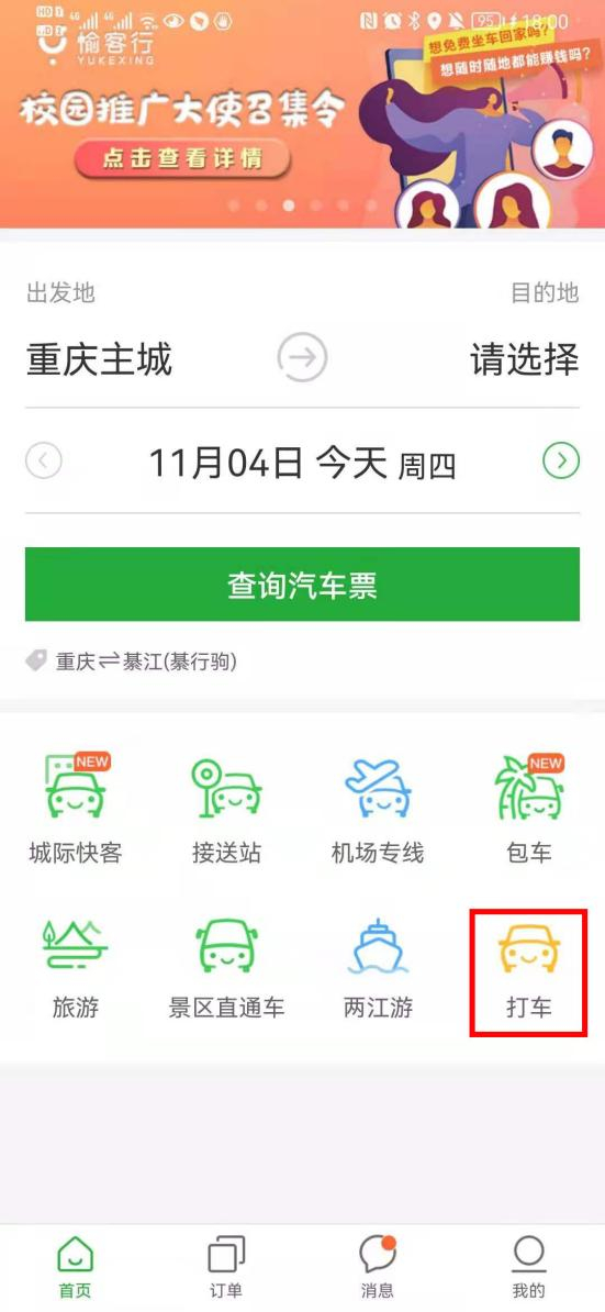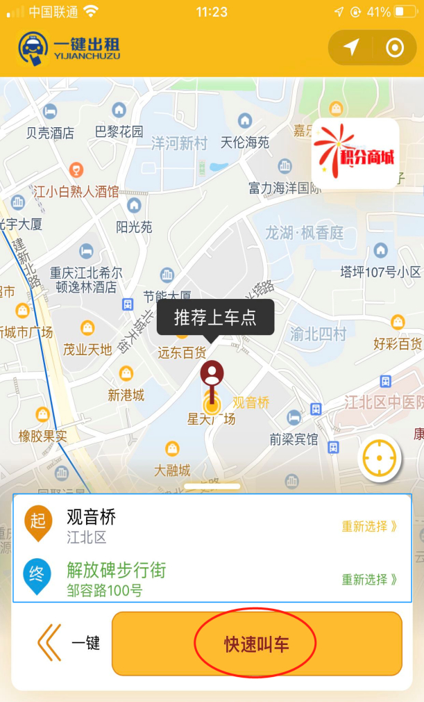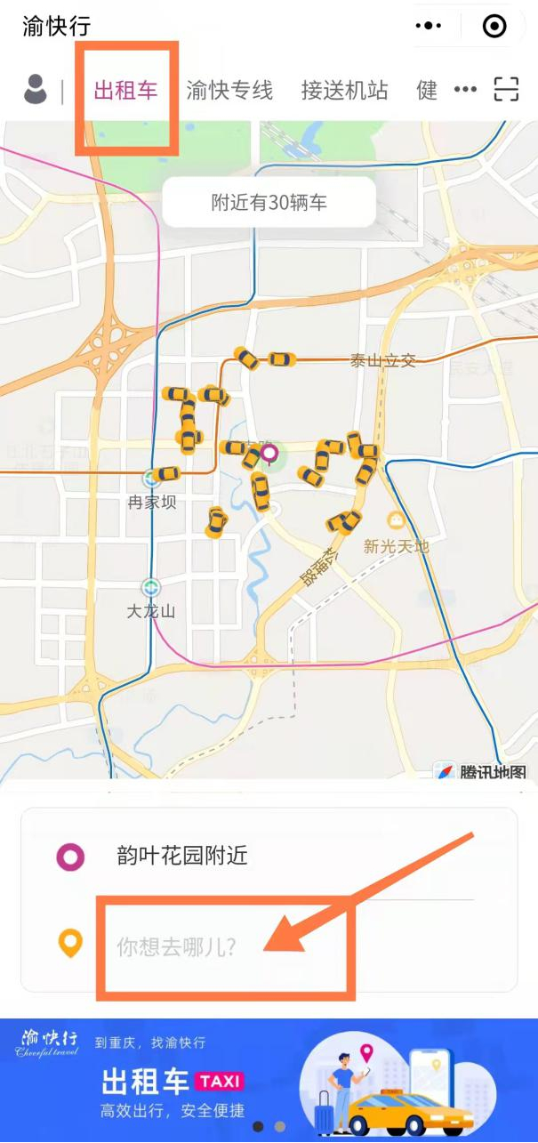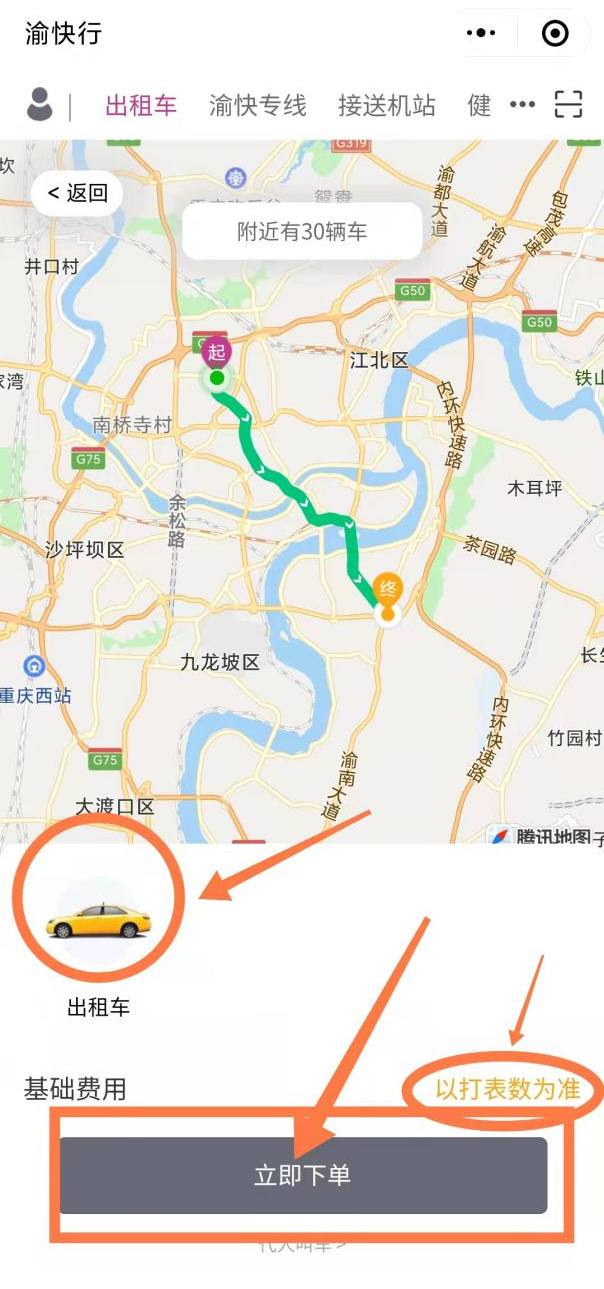 ②“渝快行用车”微信小程序:出租车——输入乘车起点和终点——点击“立即下单”按钮