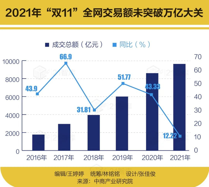 对比之下,今年“双11”的关键词之一却换成了年轻人的兴趣寥寥,更遑论“双12”了。中商产业研究院数据显示,2021年“双11”全网交易额为9651.2亿元,同比增长12.22%,未突破万亿大关。