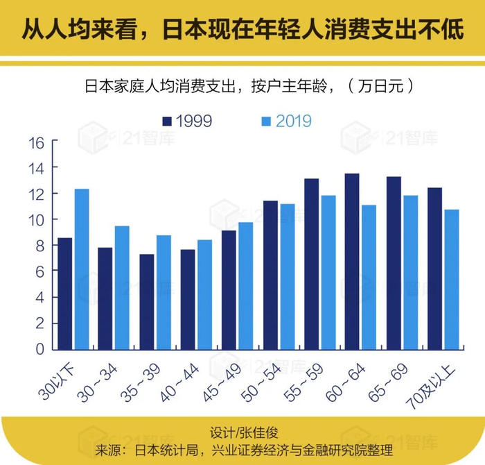 从数据上来看,日本年轻人的消费支出其实是在不断增长的。据日本统计局,日本30岁以下的年轻人人均消费支出在近30年出现大幅上升,至2019年在所有年龄段中处于最高水平。