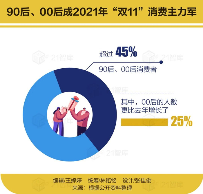 从各大平台反馈的数据来看,今年“双十一”期间,90后、00后消费者占比已经超过45%;当中,00后的人数更比去年增长了25%。