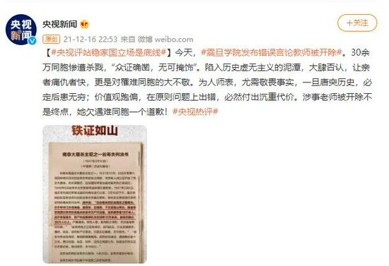 [#央视评站稳家国立场是底线#]今天,#震旦学院发布错误言论教师被开除#。30余万同胞惨遭杀戮,“众证确凿,无可掩饰”。陷入历史虚无主义的泥潭,大肆否认,让亲者痛仇者快,更是对罹难同胞的大不敬。为人师表,尤需敬畏事实,一旦唐突历史,必定后患无穷;价值观跑偏,在原则问题上出错,必然付出沉重代价。涉事老师被开除不是终点,她欠遇难同胞一个道歉!#央视热评#