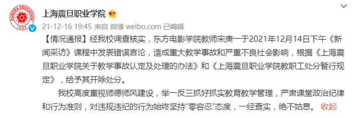 经我校调查核实,东方电影学院教师宋庚一于2021年12月14日下午《新闻采访》课程中发表错误言论,造成重大教学事故和严重不良社会影响,根据《上海震旦职业学院关于教学事故认定及处理的办法》和《上海震旦职业学院教职工处分暂行规定》,给予其开除处分。