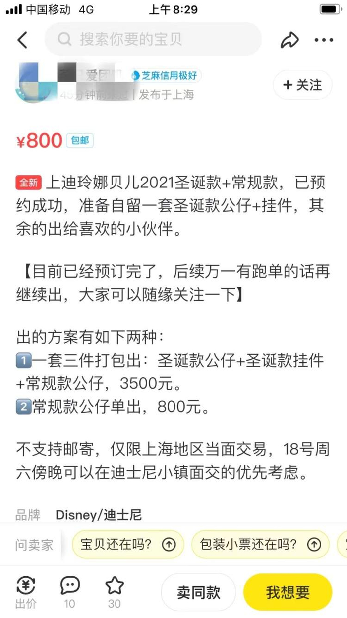 黄女士告诉记者,她住在老闵行那里,一早换了几趟地铁来到迪士尼,女儿是迪士尼粉丝,但是上周日没有刷到名额,今天上班所以没办法来,就叫母亲来,看看哪个粉丝愿意卖出来,“礼拜天晚上,我们家里4个手机在刷,都没有刷到。女儿就想要那个圣诞款的玲娜贝儿,我也不理解这个东西有什么好,女儿30多岁了,很迷这些。”