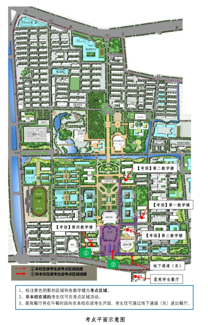 校内考点区域实行封闭管理,进入考点区域的考生必须佩带口罩。本校在读的考生凭准考证从四教与西地下通道之间的考点出入口进入考点范围;其他考生凭准考证从我校南大门进出考点区域,进入时间为上午 7:20-8:45,考试结束后请勿在考点区域内滞留。