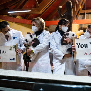 当地时间12月17日,西班牙马德里动物园为9月6日出生的一对双胞胎熊猫举行诞生100天取名仪式,两只熊猫幼崽分别获得名字“友友”和“久久”。当地时间9月6日,马德里动物园饲养的大熊猫“花嘴巴”产下一对双胞胎大熊猫幼崽,这是马德里动物园2016年以来首次有大熊猫幼崽出生,也是该动物园历史上第二次有双胞胎大熊猫幼崽出生。