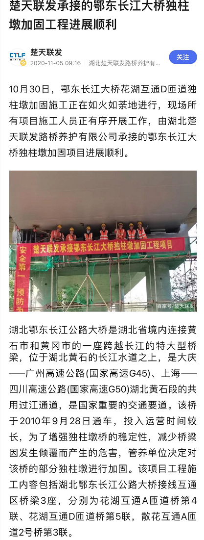2020年11月,湖北楚天联发路桥养护有限公司官方账号曾发布《楚天联发承接的鄂东长江大桥独柱墩加固工程进展顺利》一文称,2020年10月30日,鄂东长江大桥花湖互通D匝道独柱墩加固施工正在如火如荼地进行。文章指出,该桥于2010年9月28日通车,投入运营时间较长,为了增强独柱墩桥的稳定性,减少桥梁因发生倾覆而产生的危害,管养单位决定对该桥的部分独柱墩进行加固。该项目工程施工内容包括湖北鄂东长江公路大桥接线互通区桥梁3座,分别为花湖互通A匝道桥第4联、花湖互通D匝道桥第5联,散花互通A匝道2号桥第3联。