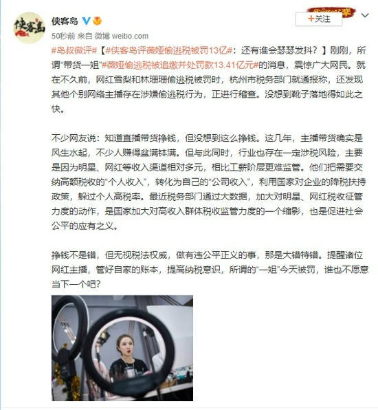 侠客岛评薇娅偷逃税被罚13亿:还有谁会瑟瑟发抖?