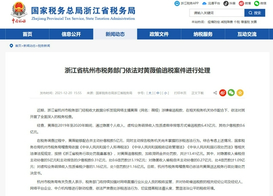 原标题:浙江省杭州市税务部门依法对黄薇偷逃税案件进行处理