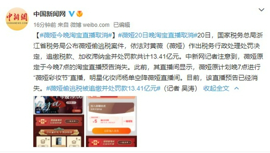 20日,国家税务总局浙江省税务局公布薇娅偷逃税案件,依法对黄薇(薇娅)作出税务行政处理处罚决定,追缴税款、加收滞纳金并处罚款共计13.41亿元。中新网记者注意到,薇娅原定于今晚7点的淘宝直播预告消失。此前,其直播间显示,薇娅原计划晚7点进行“薇娅彩妆节”直播,明星化妆师杨单空降薇娅直播间。目前,该直播预告已经消失。 (记者 吴涛)