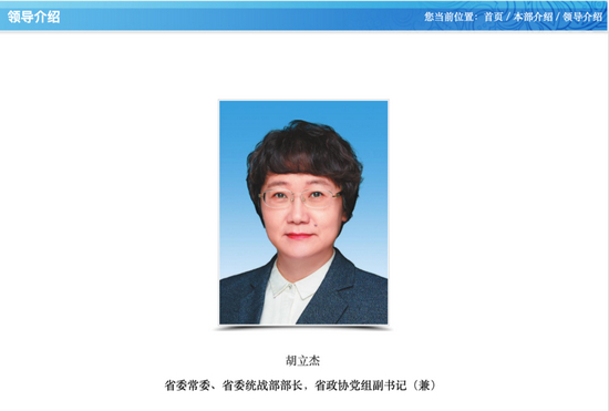 辽宁省委统战部官方网站“领导介绍”栏目近日进行更新,据最新名单显示,胡立杰已任辽宁省委统战部部长、省政协党组副书记(兼)。