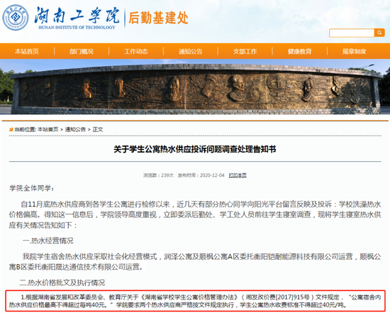 通报中校方定价的标准来自《湖南省学校学生公寓价格管理办法》,该文件规定“公寓宿舍内热水供应价格最高不得超过每吨40元”。