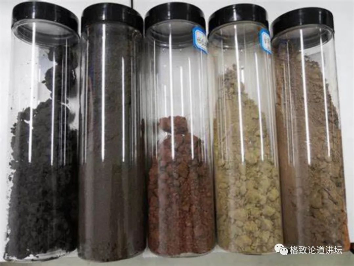 但是现在大家看,这里有几个瓶子,不同颜色的土壤性质不一样,最关键的是有机质含量不一样。但是特殊的发白的,那个里边有盐分的,就是另一种颜色了。