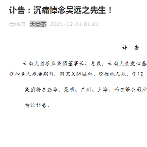据大益茶官方微信号12月21日凌晨消息,云南大益茶业集团董事长、总裁,云南大益爱心基金会理事长吴远之先生,生于1966年7月,在加拿大旅居期间,因突发脑溢血,经抢救无效,于12月19日去世,享年55岁。