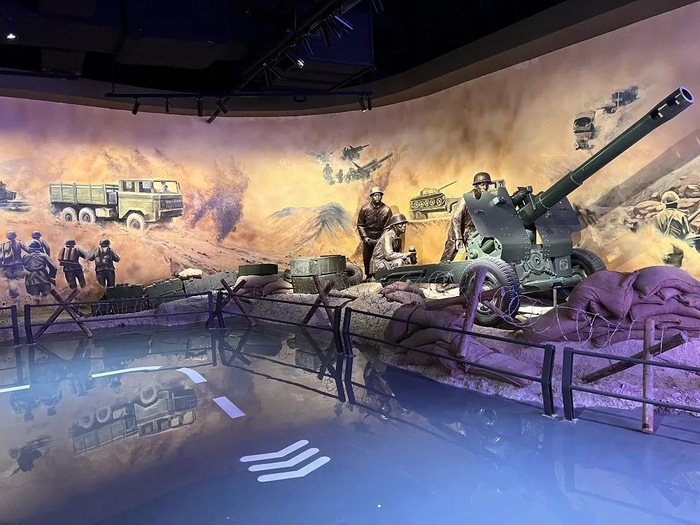 室外展区主要是工业遗产展示,是根据对越自卫反击战中老山战役的部分还原场景,展示了一辆CQ261军车实车,后面还拉载着加农炮,旁边展陈的是4000吨液压机,这些都属于我国代表性工业遗产和重要文物,是博物馆的镇馆之宝。广场中央为“中国第一辆重型军用越野车诞生地”纪念石。