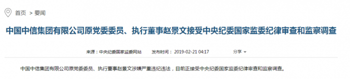 2019年2月21日,中央纪委国家监委官网发布消息,中国中信集团有限公司原党委委员、执行董事赵景文涉嫌严重违纪违法,目前正接受中央纪委国家监委纪律审查和监察调查。