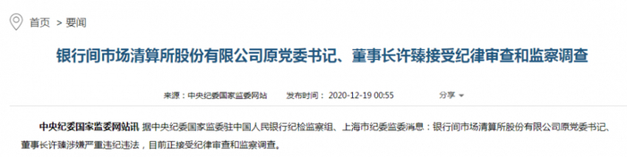 银行间市场清算所股份有限公司原董事长许臻涉嫌违规申领地方财政奖励等问题