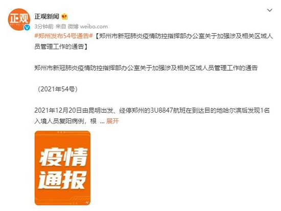 2021年12月20日由昆明出发、经停郑州的3U8847航班在到达目的地哈尔滨后发现1名入境人员复阳病例,根据疫情防控要求,现就涉及相关区域人员管理工作通告如下:
