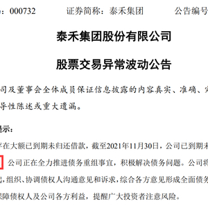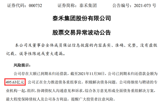 公告显示,截至2021年11月30日,泰禾集团已到期未归还借款金额为495.63亿元,目前正在全力推进债务重组事宜,积极解决债务问题。该公司将继续与聘请的专业机构一起,组织、协调债权人沟通意见和诉求,综合各方意见形成全面债务重组解决方案,最大程度保障债权人及公司各方利益。