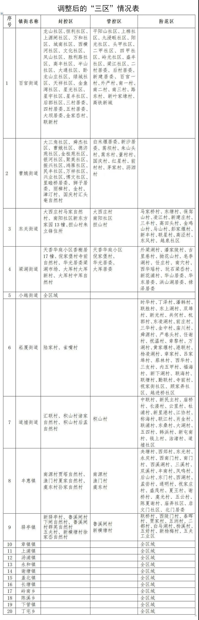 2。东关街道、梁湖街道、丰惠镇范围内自12月7日以来无确诊病例和感染者报告的社区(村居)调整为防范区。