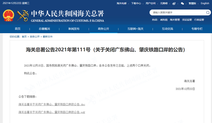 据海关总署网站22日消息,海关总署发布公告,2021年12月15日,国务院批准关闭广东佛山、肇庆铁路口岸。自公告发布之日起,上述两个口岸关闭。