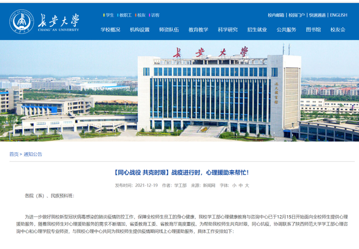 为帮助长安大学师生共克时艰,陕西师范大学快速行动,积极响应,成立了7位心理学院教授指导专家组;组建了18余名专兼职心理咨询师组成的心理援助工作组。