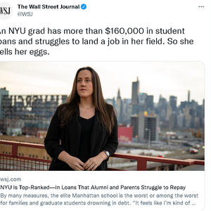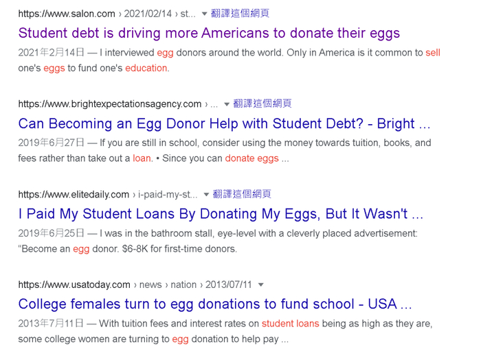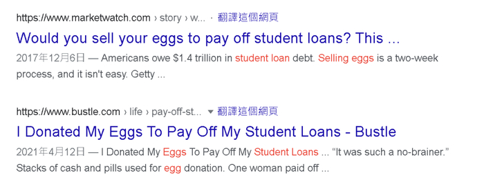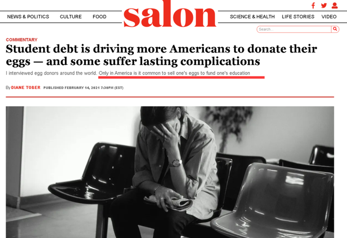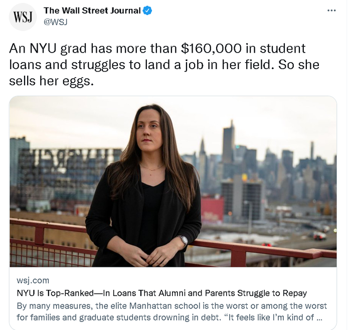 在这则报道中,美国纽约大学的一名公共卫生专业的女毕业生就表示,她为了获得这一学位已经背负了高达16万美元的学生贷款(为了支付学费和部分生活成本),可在疫情的冲击下,她很难找到能支持她偿还这笔贷款以及维持生计的工作,结果迫不得已只能靠出售自己的卵子来换钱还贷,哪怕这会对她的身体造成损害。