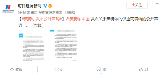 @英特尔中国 发布关于英特尔的供应商信函的公开声明。(希隆)