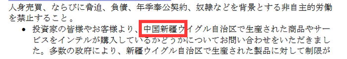 我们的投资者和客户已询问英特尔是否从中国新疆地区采购产品或服务。多个国家与地区的政府已对来自新疆地区的产品实行限制。因此,英特尔需要确保我们的供应链不使用任何来自新疆地区的劳工、采购产品或服务。