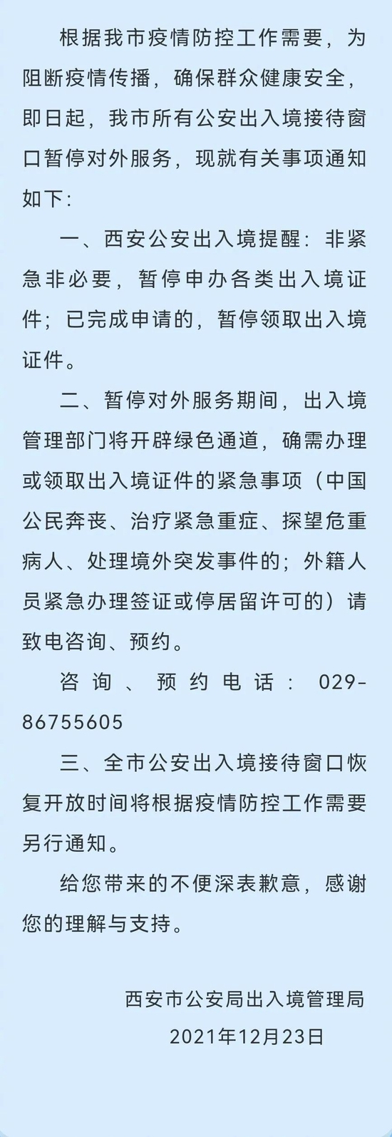 另据@西安公安 消息,根据西安市疫情防控工作需要,为阻断疫情传播,确保群众健康安全,即日起,西安市所有公安出入境接待窗口暂停对外服务,现就有关事项通知如下: