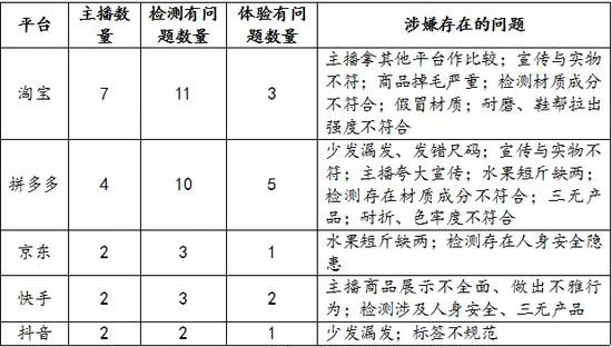 体察时发现,个别主播存在夸大宣传、用绝对性广告语、拿其他平台做比较、少发漏发、发错尺码、宣传与实物不一致等。此外,2个批次生鲜发现短斤缺两问题。