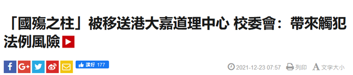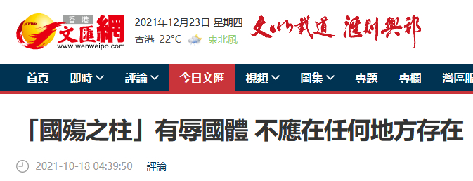 香港文汇网曾发表社论称,在香港大学校园里摆放的所谓“国殇之柱”是不祥之物,奇丑无比,充满邪气,搞得大学校园乌烟瘴气,而且有辱国体,不应存在于世界上任何地方,港大要求移除合法合理。