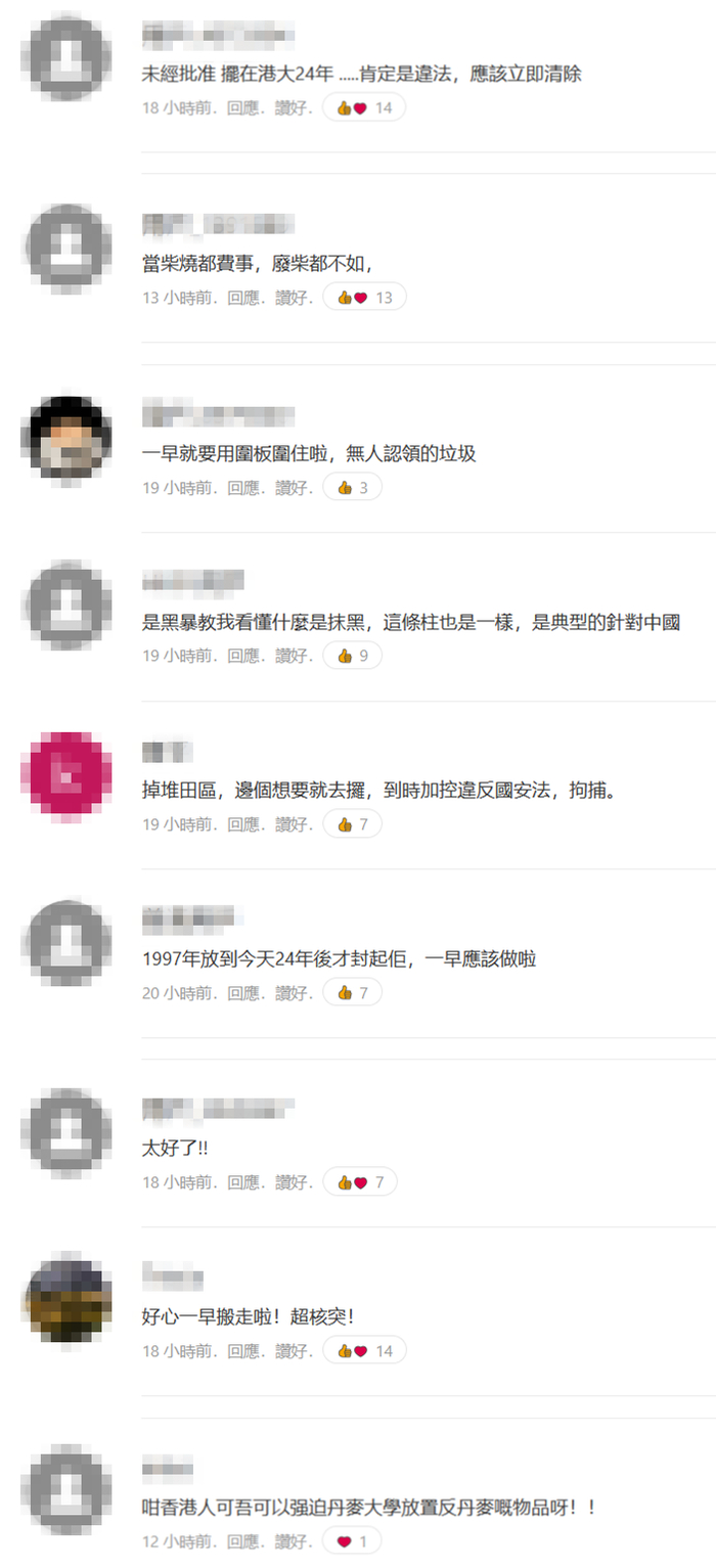 如今这个散播反中乱港信息的雕塑在祸害香港人民24年后终于拆除,不少香港网友喜大普奔,“早就该拆了,当柴烧都费事”“‘黑暴’叫我看懂什么是抹黑,这根柱也是一样,典型地针对中国”。