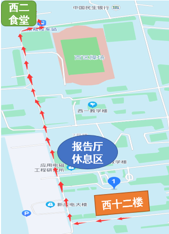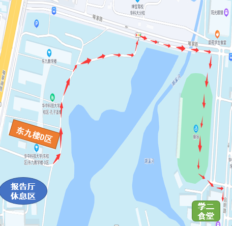 1.考点为西十二楼和东九楼D区的校外考生设立了专用食堂或休息区域,请考生自行决定是否前往。如需前往,请按下图指引的路线,配合工作人员引导,有序前往指定食堂或休息区域。