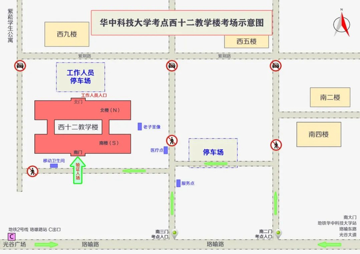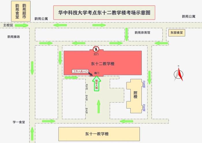 考场为西十二楼的考生仅能从南三门、南二门进校。
