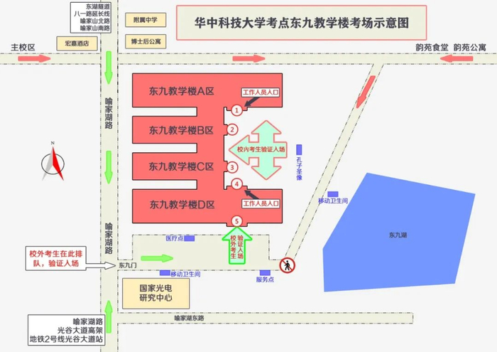 考场为东九楼D区的考生,仅能从东九门进校。