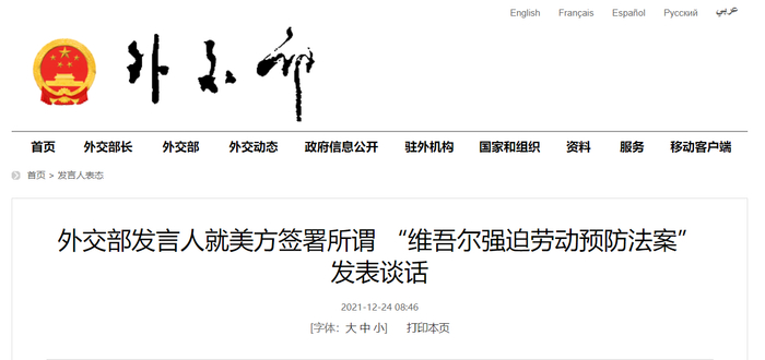 针对法案的签署,外交部发言人24日发表谈话称,该案罔顾事实真相,恶意诋毁中国新疆人权状况,严重违反国际法和国际关系基本准则,粗暴干涉中国内政,中方对此表示强烈愤慨、坚决反对。中方正告美方,利用涉疆问题搞阴谋诡计,阻挡不了新疆各族人民追求美好生活的坚定步伐,阻挡不了中国不断发展壮大。美方行径完全违背市场规则和商业道德,只会破坏全球产业链供应链稳定,扰乱国际贸易秩序,损害美自身利益和国家信誉,纯属搬起石头砸自己的脚。
